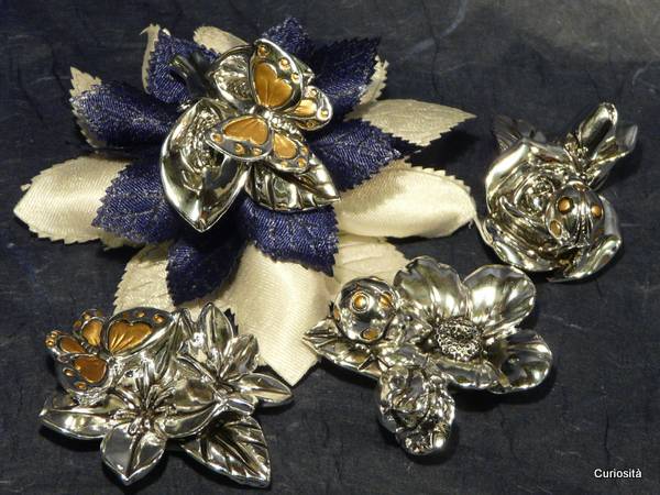 Elegante composizione adatta per il festeggiamento di varie ricorrenze. La proposta include un delicato rametto di fiori in resina argentata applicato sul sacchettino creato con una coccarda portaconfetti in raso di colore avorio e guarnito da una coccarda in raso operato blu con motivo a foglie analogo al portaconfetti. Il rametto di fiori, lunghezza circa cm. 5,5 viente fornito in quattro soggetti differenti; su due c'e' una farfallina che rifinisce, mentre sugli altri due c'e' una coccinella. E' incluso nella confezione, diametro circa cm. 10, il bigliettino che stamperemo con i dati da voi forniti. Ricordate di scegliere i confetti che preferite.