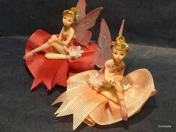 Simpatica composizione adatta per il Battesimo e la Prima Comunione. La proposta include una delicata fatina dei fiori in colori pastello applicata su un grazioso sacchetto realizzato con una farfallina di tulle con i confetti, guarnita da una rouche operata e rifinita da un nastro in tinta dello stesso genere. La confezione, altezza circa cm. 9 e diametro circa cm. 11, e' proposta in due colori differenti, mentre le fatine sono assortite in quattro posizioni leggermente differenti. E' incluso nella confezione il bigliettino che stamperemo con i dati da voi forniti. Ricordate di scegliere i confetti che preferite.