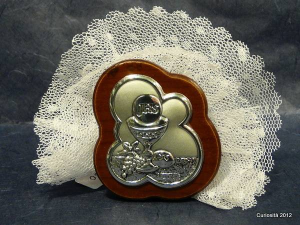 Elegante composizione adatta per il festeggiamento della Prima Comunione. La proposta include una basetta con lastrina in argento raffigurante i simboli del sacramento festeggiato, guarnita da una nuvoletta di veli bianchi con fantasia a pois. L'immaginetta ha un'altezza di cm. 5,7, mentre tutta la confezione misura circa cm. 8. E' incluso nella confezione il bigliettino che stamperemo con i dati da voi forniti. Ricordate di scegliere i confetti che preferite.