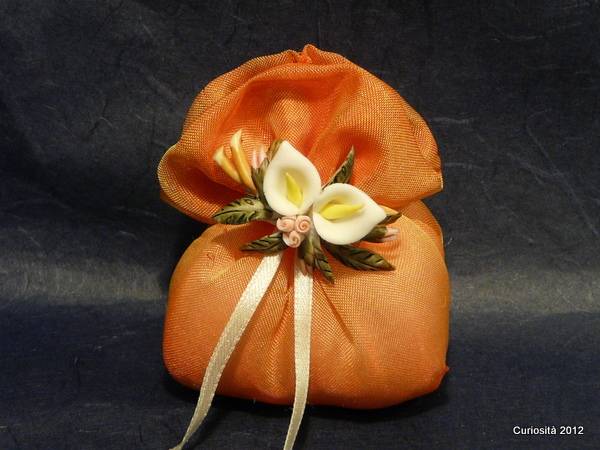 Simpatica composizione adatta per il festeggiamento di varie ricorrenze. La proposta include una delicata spilletta in porcellana applicata su un piccolo saccottino in organza arancio, altezza della confezione circa cm. 7,5. Il tutto e' rifinito da un nastrino in raso avorio. E' incluso nella confezione il bigliettino che stamperemo con i dati da voi forniti. Ricordate di scegliere i confetti che preferite.