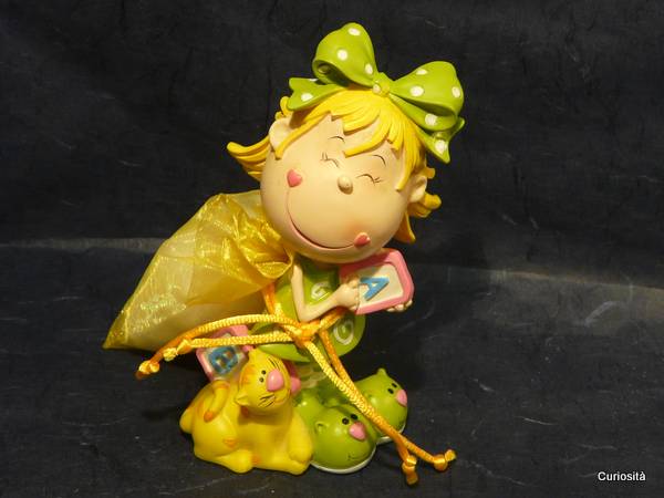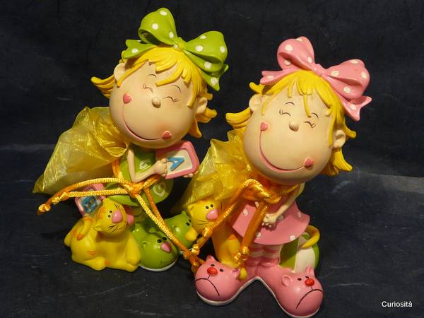 Simpatica composizione adatta per il festeggiamento di Battesimo e Prima Comunione. La proposta include una spiritosa bimba in resina colorata e un saccottino in organza gialla con all'interno una farfallina di tulle per contenere i confetti. La bimba accompagnata da un tenero gattino, altezza circa cm. 13, viene fornita in due soggetti differenti, una vestita di verde ed una di rosa/fuxia. E' incluso nella confezione il bigliettino che stamperemo con i dati da voi forniti. Ricordate di scegliere i confetti che preferite.