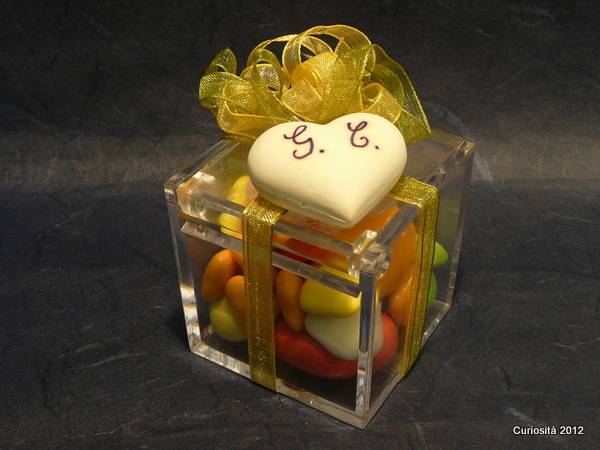 Simpatica composizione adatta per il Matrimonio e l'Anniverasio. La proposta include una scatolina in plexiglass di cm. 5x5x5 ed un gessetto profumato a forma di cuore, larghezza circa cm. 3,5. Il gessetto, adatto per la profumazione dei cassetti di biancheria, viene personalizzato con le cifre degli sposi ed il tutto e' rifinito da spiritosi ricci in organza gialla e verde. Nel prezzo sono inclusi dei piccoli cuoricini colorati al cioccolato e n. 5 confetti della linea Maxtris in colori e gusti assortiti (il cuore di mandorla e' rivestito da cioccolato gianduia, cioccolato fondente, amarena, fragola, arancio, cocco, limone o mela verde a seconda del colore). E' incluso nella confezione il bigliettino che stamperemo con i dati da voi forniti.
