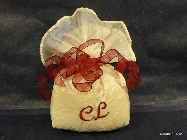 Raffinato saccottino medio in scianto di colore avorio con bordo di organza in tinta. Rifinito da nastrini in organza bordo', il saccottino e' personalizzato con le cifre degli sposi ricamate in bordo'. E' possibile personalizzare anche il colore del ricamo. Altezza della confezione circa cm. 12. E' incluso nella confezione il bigliettino che stamperemo con i dati da voi forniti. Ricordate di scegliere i confetti che preferite.
