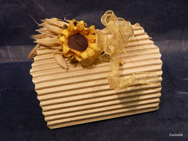 Scatolina realizzata con cartoncino tipo "onda" in colore beige. Guarnita da una piccola composizione con girasole e avena essiccata e rifinita da un nastrino in organza gialla. La scatolina misura cm. 7,5x4,3, altezza 5. L'eccezionale proposta include nel prezzo n.5 confetti al cioccolato e il bigliettino che stamperemo con i dati da voi forniti.