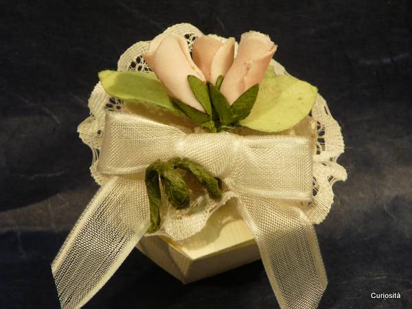 Scatolina realizzata con cartoncino tipo "seta" in colore avorio. Guarnita da una rouche di pizzo avorio con l'applicazione di un delicato mazzolino di boccioli rosa e rifinita da un fiocco in organza avorio. La scatolina misura cm. 6x6, altezza 3. L'eccezionale proposta include nel prezzo n.5 confetti al cioccolato e il bigliettino che stamperemo con i dati da voi forniti.