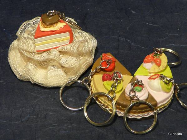 Simpatica composizione realizzata da una graziosa confezione creata con una balza di organza operata di colore avorio chiusa a saccottino e rifinita da un simpatico portachiavi a forma di fetta di torta. Diametro della confezione circa cm. 7. Il potachiavi viene fornito in 6 varianti di colori assortiti. E' incluso nella confezione il bigliettino che stamperemo con i dati da voi forniti. Ricordate di scegliere i confetti che preferite.