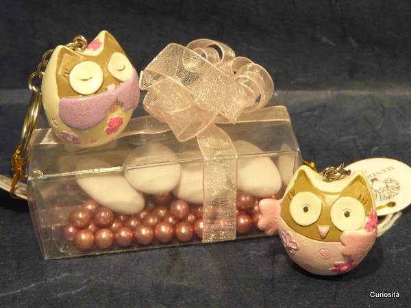 Scatolina realizzata in pvc trasparente, guarnita da una spiritosa gufetta con portachiavi e rifinita da nastrini in organza rosa. La gufetta, altezza circa cm. 3, e' fornita in due posizioni leggermente differenti con delicate colorazioni diverse (fondo avorio e fondo rosa).La scatolina misura cm. 8x4, altezza 3. L'eccezionale proposta include nel prezzo n.5 confetti al cioccolato, circa 13 gr. di confettini sferici in colore metallizzato sul rosa/lilla e il bigliettino che stamperemo con i dati da voi forniti.