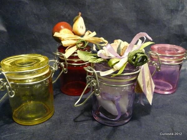 Simpatici barattolini in vetro colorato adatti al festeggiamento di varie ricorrenze, altezza circa cm. 6, guarniti da composizione di fruttini e fiori assortiti e rifiniti da raffia e natrini colorati abbinati al colore del barattolino. I barattolini sono in quattro colori assortiti (rosso, giallo, lilla e rosa). La proposta include la confezione di un mini-sacchetto all'interno del barattolino e una composizione sul caperchio. Per quelli rosso e giallo sono previsti dei fruttini, mentre per il lilla e il rosa dei fiorellini, nel caso abbiate delle preferenze differenti vi preghiamo di comunicarcelo. E' incluso nella confezione il bigliettino che stamperemo con i dati da voi forniti. Ricordate di scegliere i confetti che preferite.