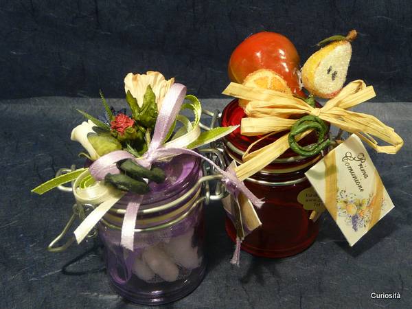 Simpatici barattolini in vetro colorato adatti al festeggiamento di varie ricorrenze, altezza circa cm. 6, guarniti da composizione di fruttini e fiori assortiti e rifiniti da raffia e natrini colorati abbinati al colore del barattolino. I barattolini sono in quattro colori assortiti (rosso, giallo, lilla e rosa). La proposta include la confezione di un mini-sacchetto all'interno del barattolino e una composizione sul caperchio. Per quelli rosso e giallo sono previsti dei fruttini, mentre per il lilla e il rosa dei fiorellini, nel caso abbiate delle preferenze differenti vi preghiamo di comunicarcelo. E' incluso nella confezione il bigliettino che stamperemo con i dati da voi forniti. Ricordate di scegliere i confetti che preferite.