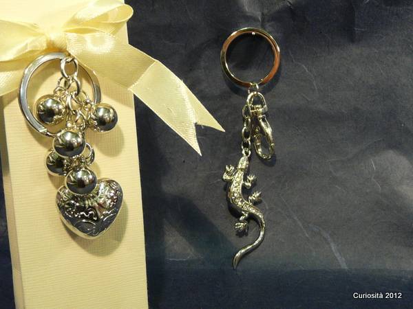 Elegante composizione adatta per il festeggiamento di varie ricorrenze. La proposta include un portachiavi con jeco argentato e guarnito da strass, lunghezza circa cm. 13, legato su una scatolina griffata dalla ditta di colore avorio, lunghezza circa cm. 15,5. Il tutto, come per il portachiavi cuore e sfere, e' rifinito da un nastro di raso in colore avorio ed include la confezione di un mini-sacchetto per inserire i confetti all'interno della scatolina. E' incluso nella confezione il bigliettino che stamperemo con i dati da voi forniti. Ricordate di scegliere i confetti che preferite.