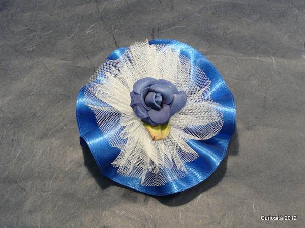 Ciuffettino in tulle bianco rifinito da coccarda alta in raso blu elettrico e guarnito da rosa in lattice blu. Diametro della confezione circa cm. 9,5. E' incluso nella confezione il bigliettino che stamperemo con i dati da voi forniti. Ricordate di scegliere i confetti che preferite.