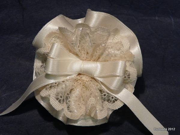 Delicato sacchettino in colore avorio composto da una farfallina in tulle con confetti guarnita da coccarda bassa in raso, elegante pizzo e rifinita da un doppio fiocchetto centrale di raso. Diametro della confezione circa cm. 7,5. E' incluso nella confezione il bigliettino che stamperemo con i dati da voi forniti. Ricordate di scegliere i confetti che preferite.