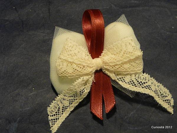 Semplice sacchettino composto da una farfallina in tulle con confetti guarnita da un doppio fiocco di pizzo in colore avorio e nastrini bordo'. Larghezza della confezione circa cm. 6. E' incluso nella confezione il bigliettino che stamperemo con i dati da voi forniti. Ricordate di scegliere i confetti che preferite.